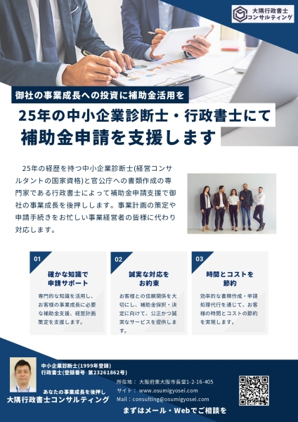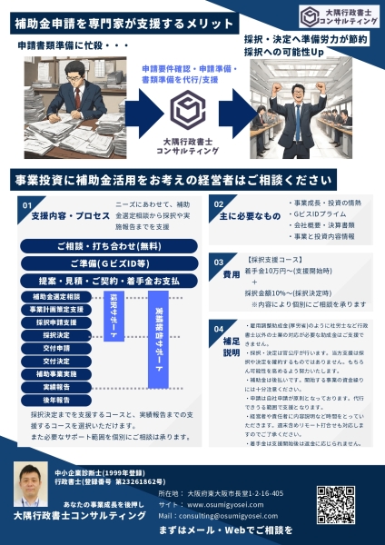 大阪を中心に、補助金申請支援を専門家が丁寧に対応いたします。